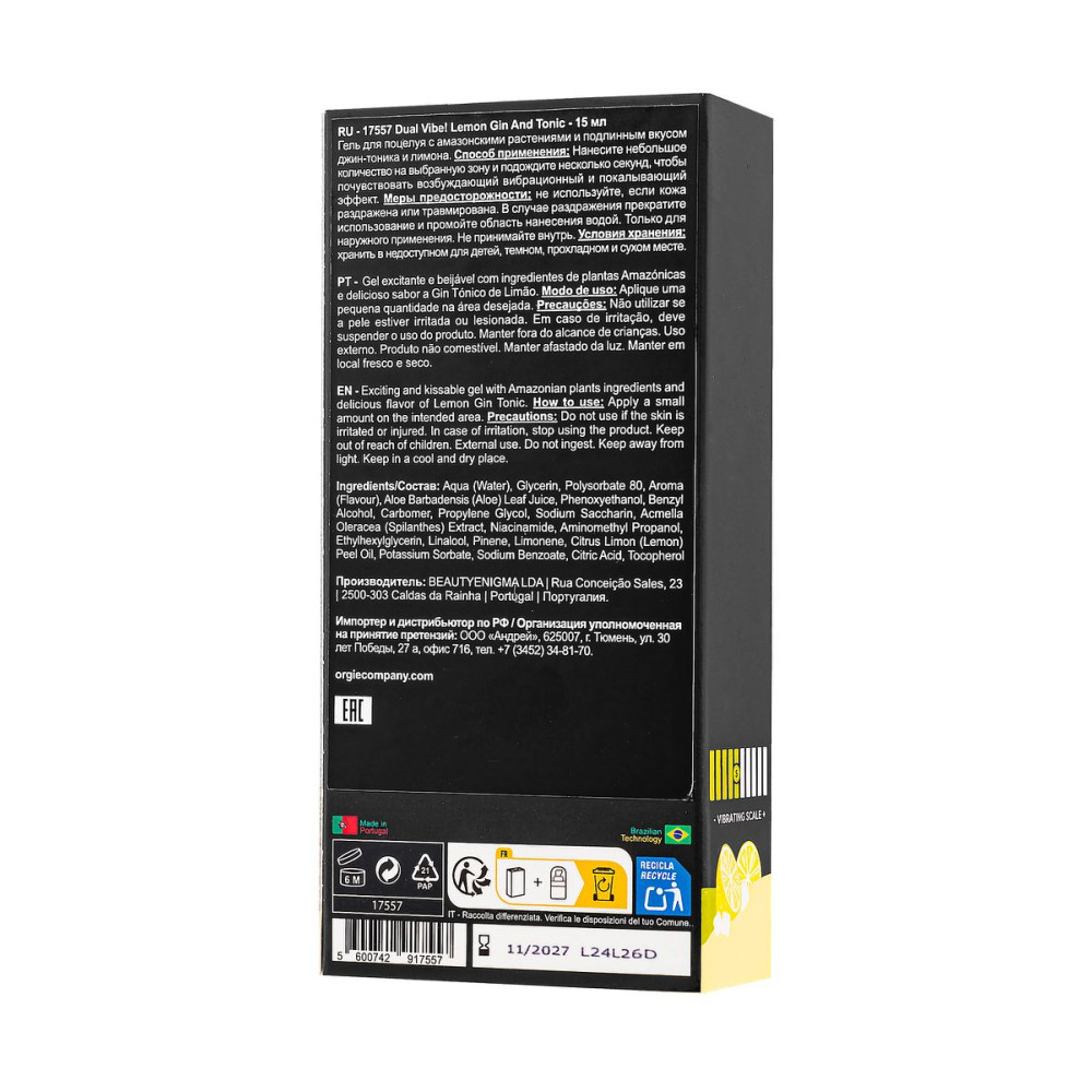 Погрузитесь в мир тропического наслаждения с Dual Vibe! Lemon Gin And Tonic от Orgie — жидким вибратором для поцелуев, который привносит нотку изысканности в ваши интимные моменты.