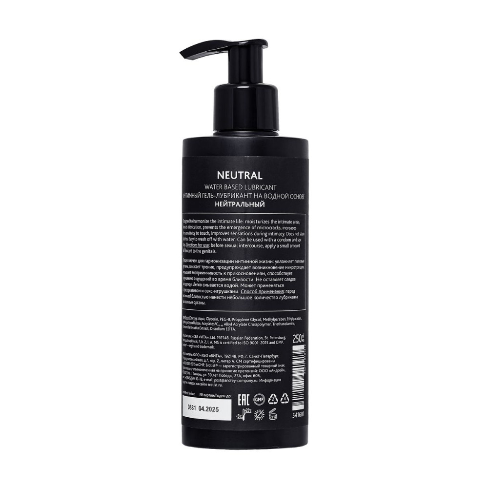 Лубрикант Erotist Neutral имеет водную основу, гипоаллергенен, совместим с презервативами и игрушками для взрослых, не оставляет следов и легко смывается водой.