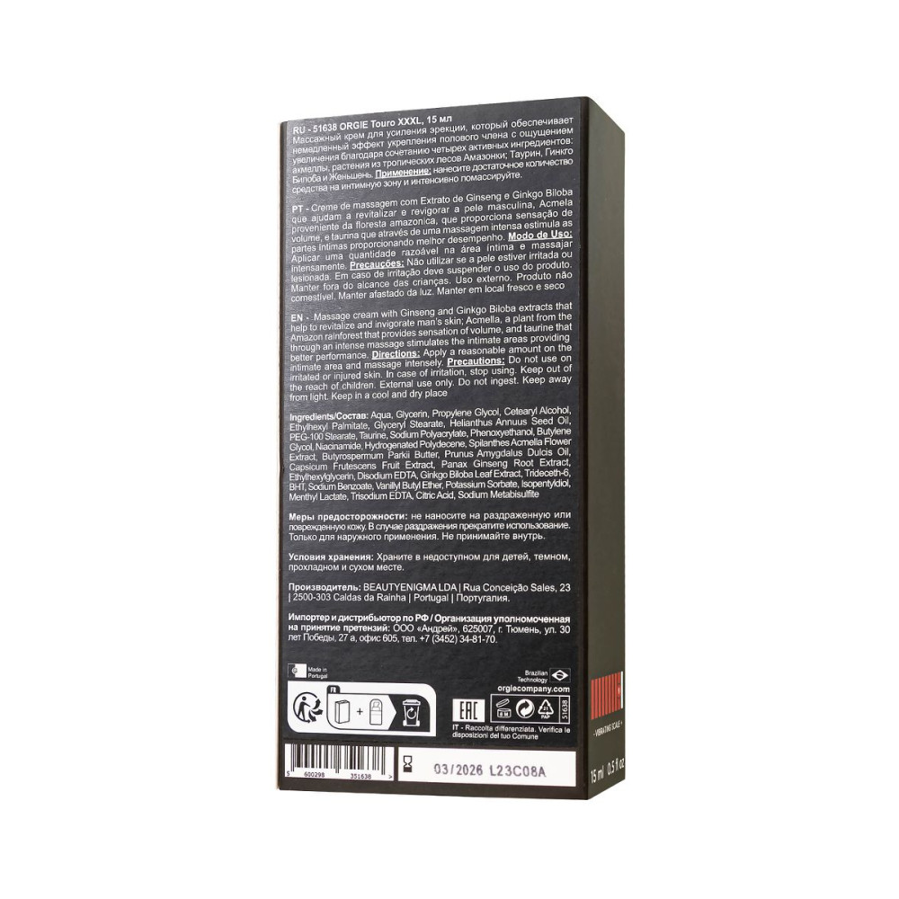 Возбуждающий крем с эффектом вибрации для мужчин ORGIE Touro XXXL – тайный ключ к новым ощущениям. Этот крем создан для того, чтобы усилить эрекцию, придавая половому члену немедленное увеличение благодаря уникальной комбинации активных ингредиентов.