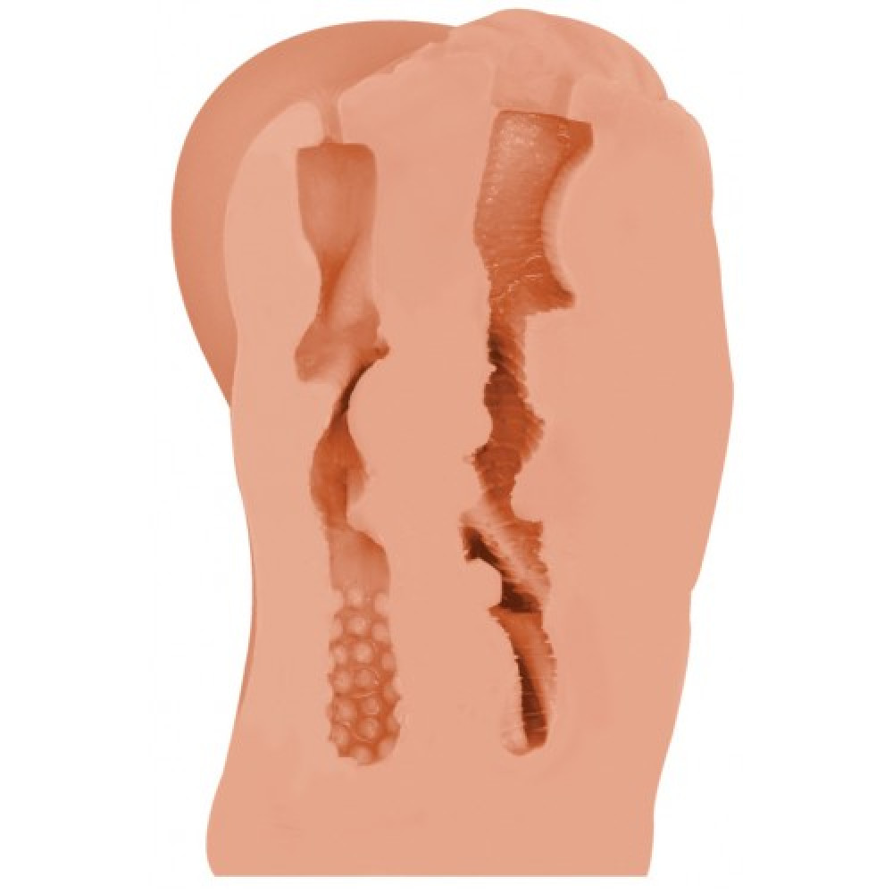 Он выполнен в виде двух любовных отверстий: женской вагины и узенького ануса. Создан мастурбатор из мягкого и эластичного материала.